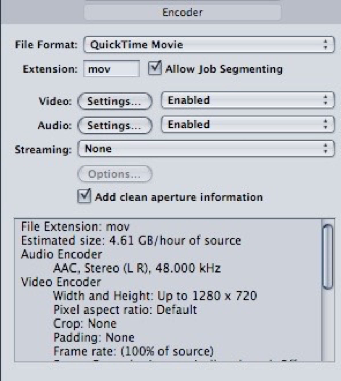 You can set the format at the top, changing from MPEG to QuickTime. You’ll get a warning if you do that. Notice the checkbox for job segmenting. This is only applicable if you’re using multiple computers to encode one job.