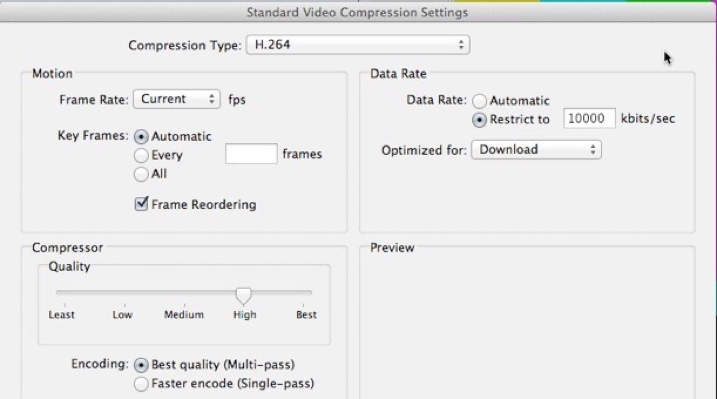The Compression Type pop-up gives you access to the entire list of codecs you have installed, including x264 (a better H.264), REDCODE, Media 100, or an XDCAM codec. A 264 codec is the best for web use. Use H.264 or x264 for the web. Frame rate will not make much difference to file size because of the way modern codecs work.