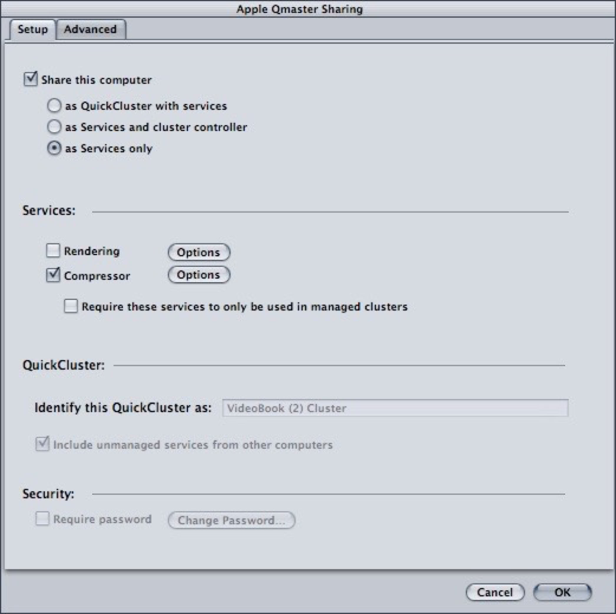 To set up Qmaster open Compressor on each machine you want to use and from the menus select Apple Qmaster>Share This Computer. In the dialog check on Share this computer and select Services only. Also check on Compressor under Services.