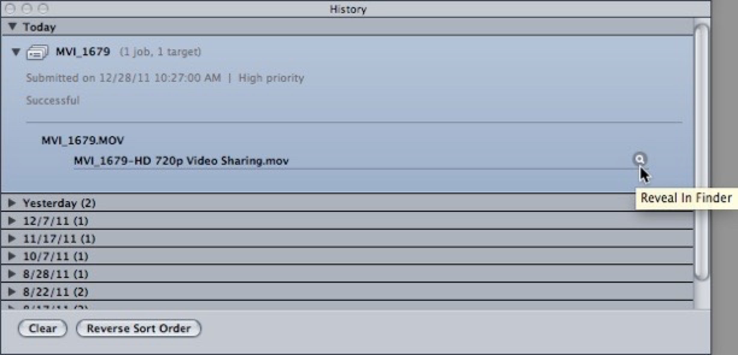 In History, if you twirl open the disclosure triangle for the job you’ll see the output file name and on the right a magnifying glass, which is a button that will take you to the file in its destination location.
