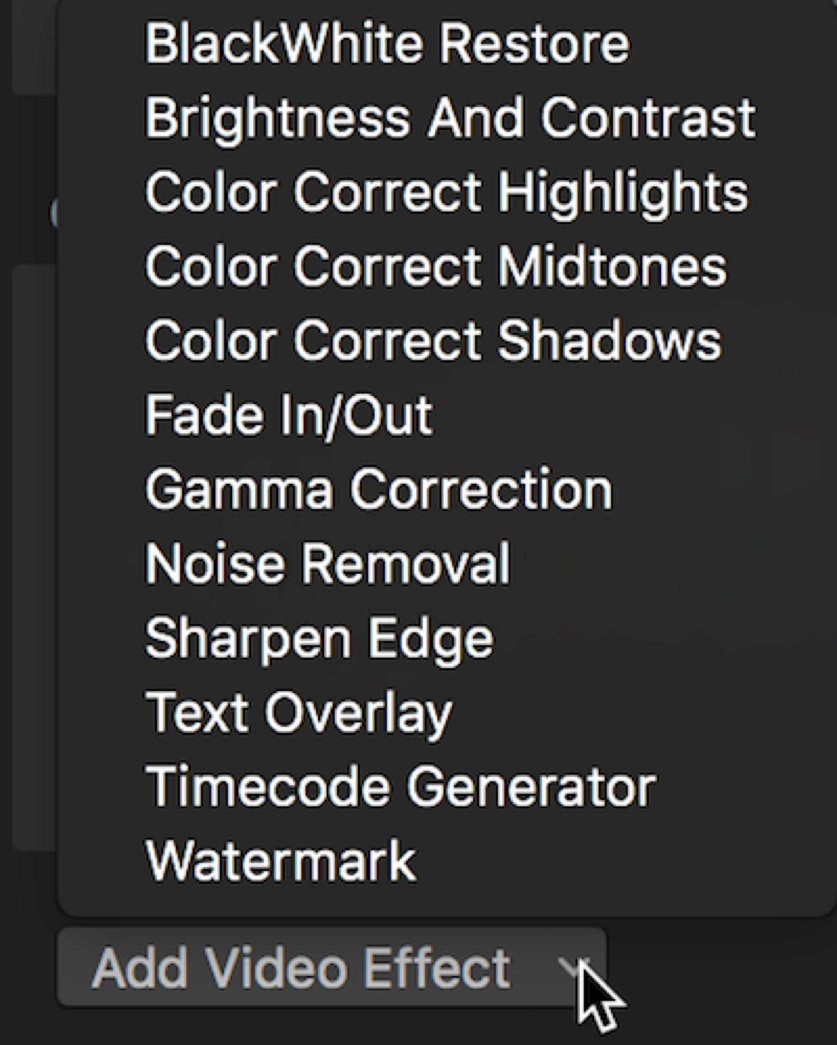 You can add video effects to the output in Compressor, but there are very few that you should ever use. You might use the three at the bottom, Text Overlay, Timecode Generator, and Watermark (see Figure 17).