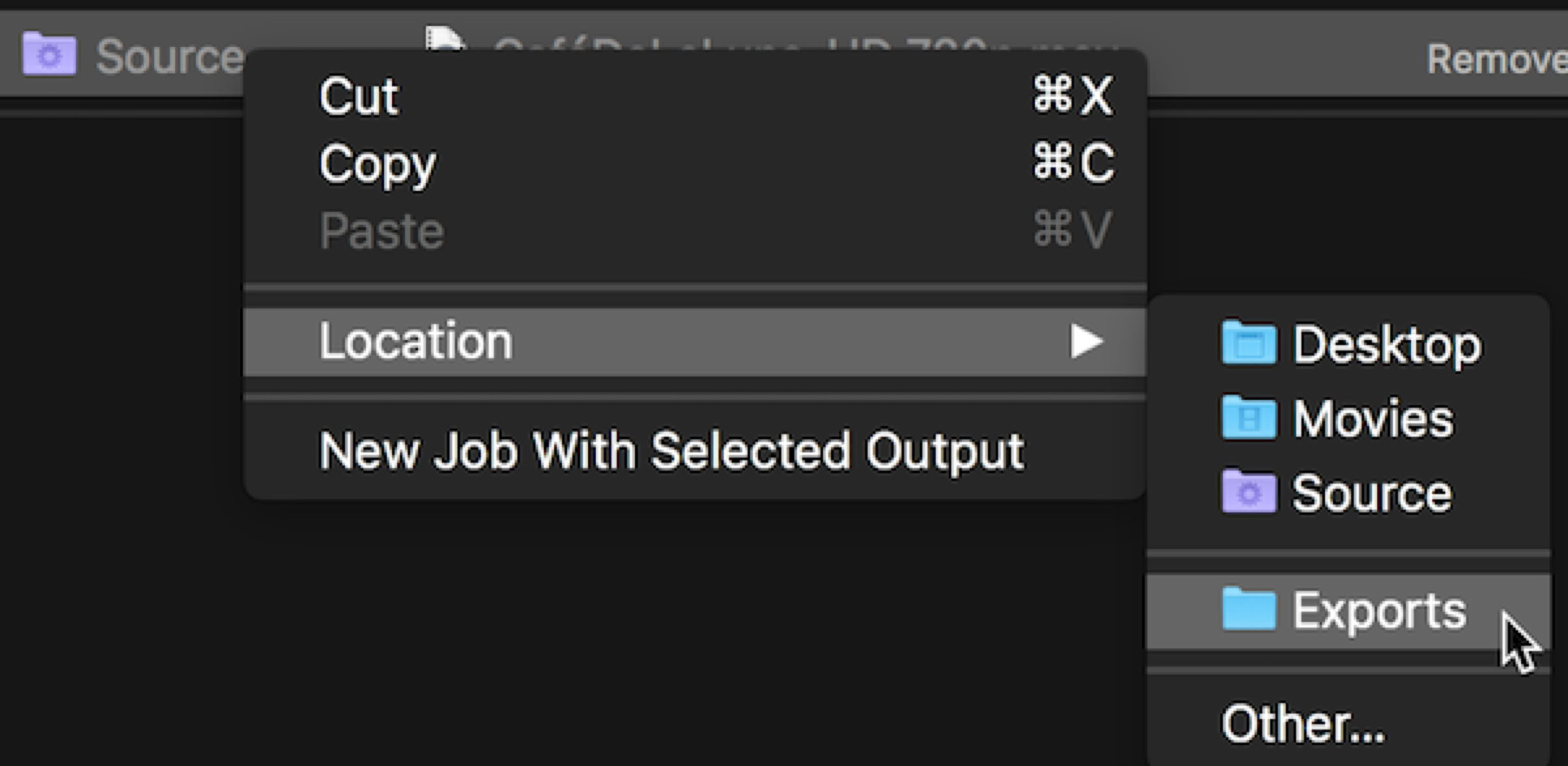 There are three ways to create a custom preset. In the Settings tab you can click on the + button in the lower left and select New Setting. In this popup is also an option to New Destination, which creates a job action, like publish to Vimeo, or all the other available options. There is an option to make a New Group, which is basically a container for multiple formats that get applied together, such as audio and video for DVD, or other formats that you might repeatedly have to apply to a file. To create a New Location go to the Locations pane, at the top next to Settings. Here the + button in lower left while let you pick a location on your drives where you want to save your output files. This option will then be available for any setting when you right-click on the Location in the setting (see Figure 13).