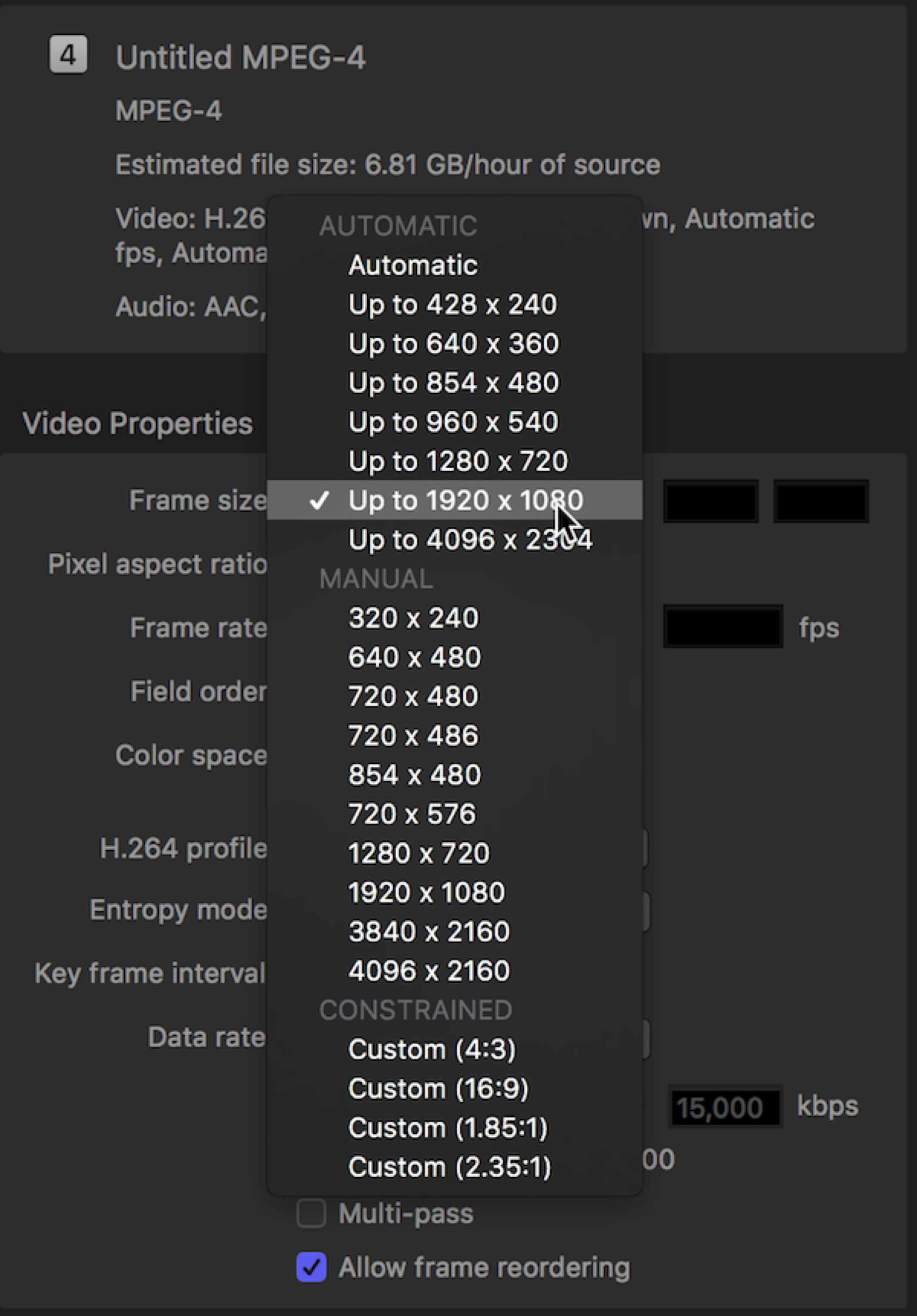 The General pane shows that the default setting for MPEG-4 is standard definition 640x480 at 29.97. If you go to the Video pane the same setting appears there with a very low data rate of 1000 kbps. It’s a starting point, but probably not one you want to use. If you’re working with HD material, which is always widescreen, the output will be anamorphically squeezed and not suitable for anything. Start by changing the Frame size popup to something else; perhaps under Automatic set it to up to 1920x1080 as in Figure 18.