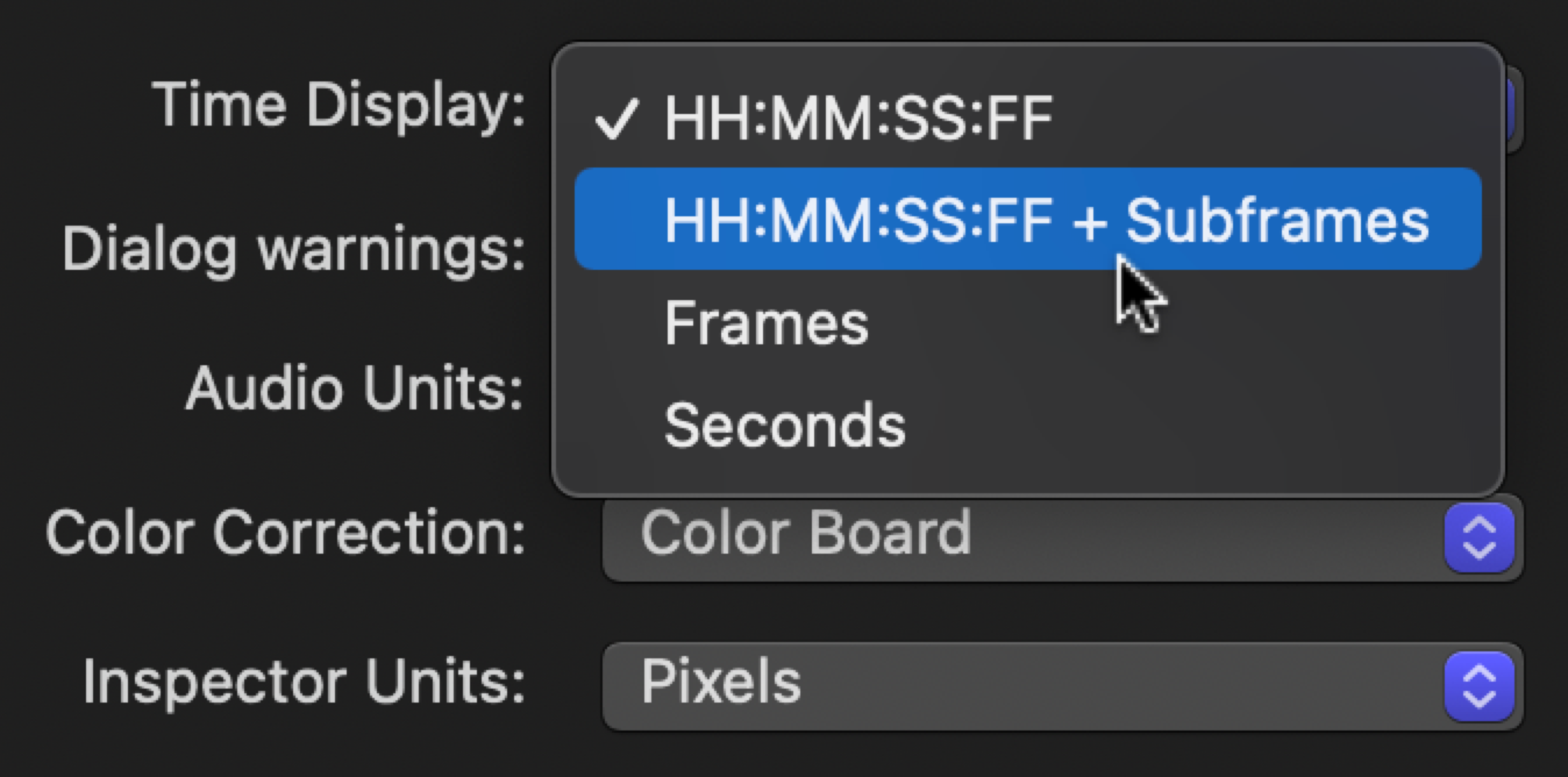 Frames can be useful if you’re having problems sharing. Sometimes an error dialog will appear saying the application has a problem encoding a specific frame number. Changing to the Frames display, which is a straight count of the number of frames in the clip or the timeline starting at zero, makes it easy to find the problem frame. Usually in this case there’s a problem with the media or an effect, and you have to change out the shot or the effect or cut around it. Not sure of the benefit of Seconds.