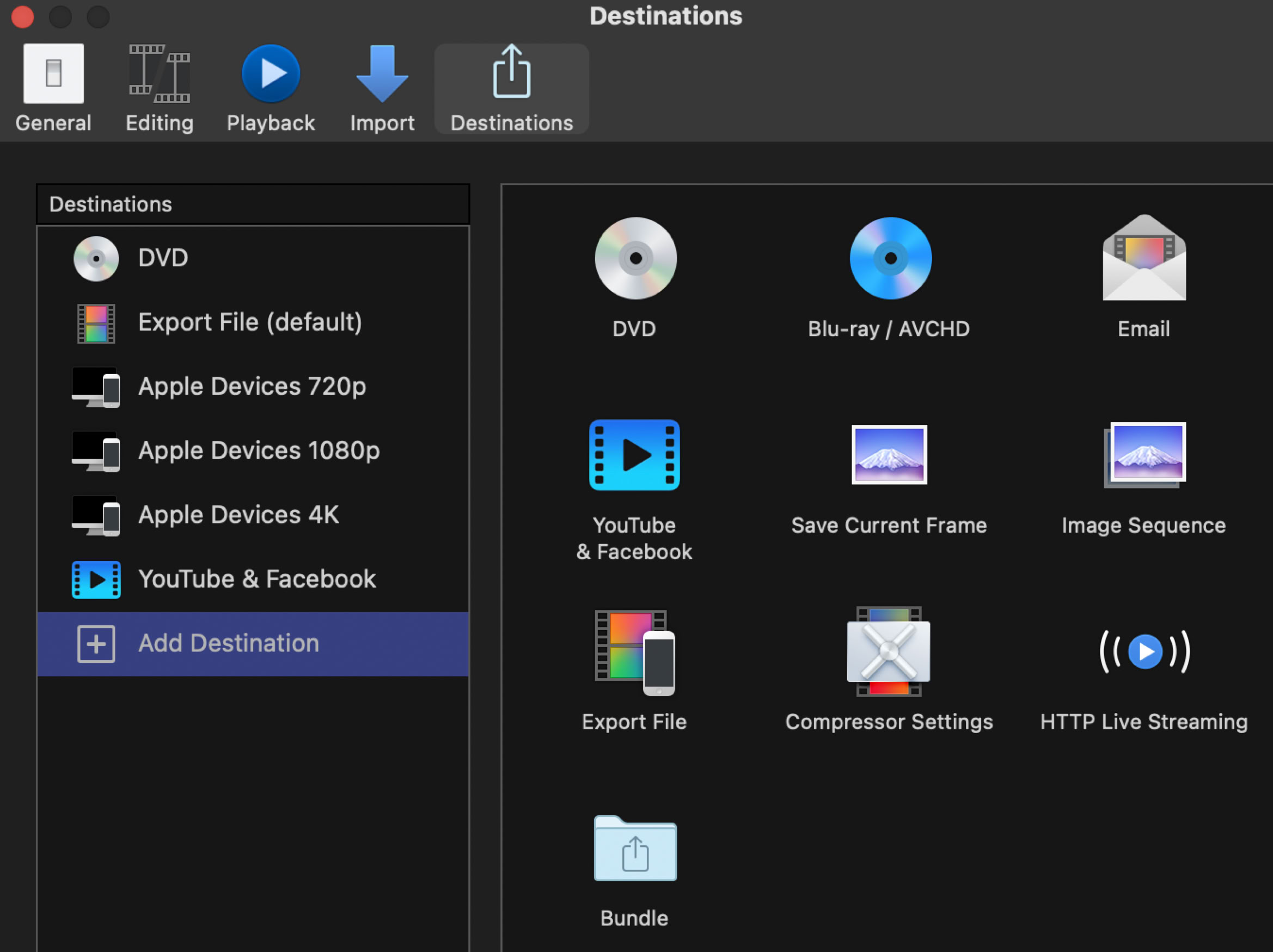If you’ve come to FCPX from other video editing applications, one think that will strike you about the FCP preferences is how minimalist they are. Clearly there was a deliberate effort made to simplify this from the original 17 panels of preferences that were in legacy FCP. They might have gone a bit too far in their zeal, and there are probably some preferences that should be there, and others that perhaps should be different, but I guess that’s why they’re called preferences. So let’s look at the panels. To access preferences open them from the Final Cut Pro menu or use the shortcut Command-comma, which has become the standard in pretty much all Mac applications.