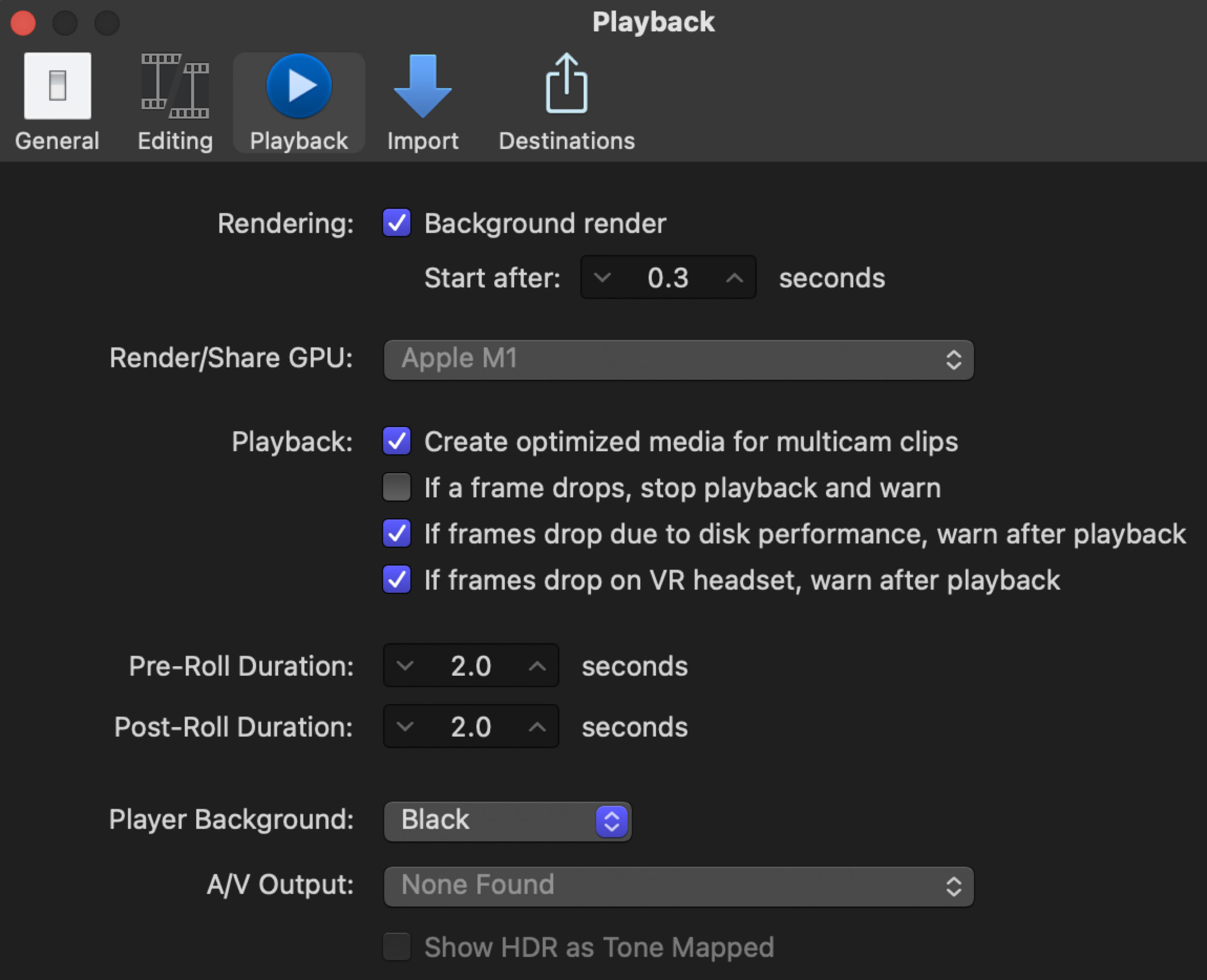 Pre-Roll and Post-Roll control how far before an edit playback starts and how far after the edit playback continues when using the play around function (Shift-/). Theseare really personal preferences. Two and two works fine for many people. When you’re editing dialogue many prefer to make it offset, something like five and two or three.