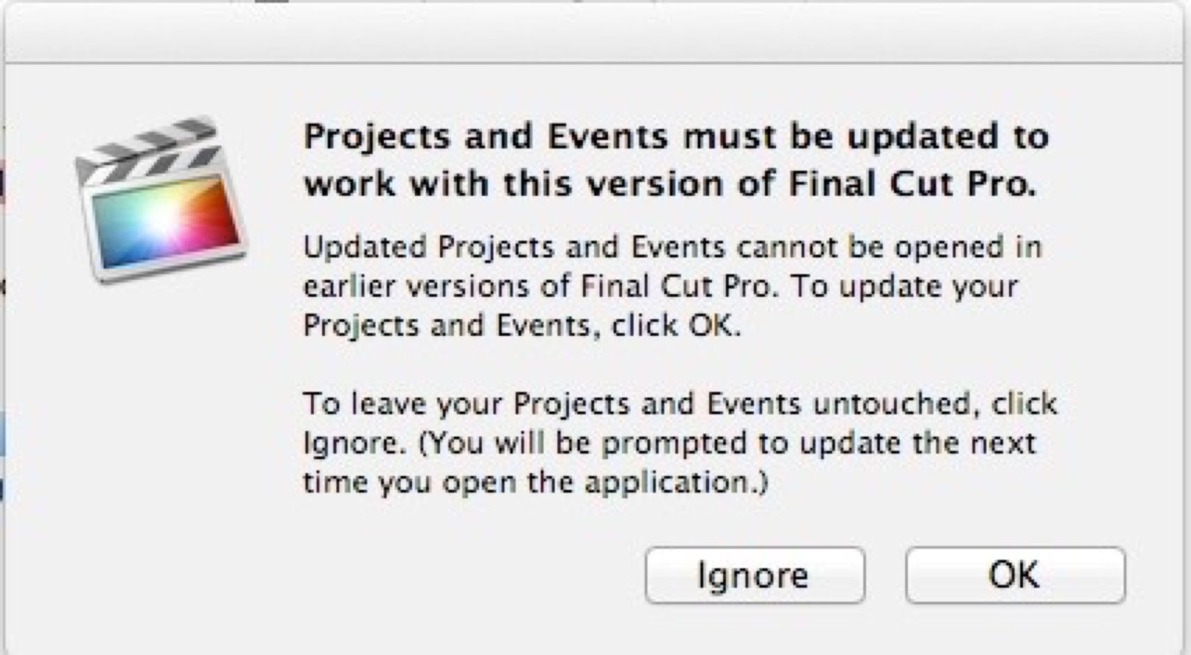All of these projects and events were originally created using FCP 10.0.2, and have been updated subsequently, but are likely not in the most recent version. When you launch a newer version of the software, you will get a dialog box asking you to update the Projects and Events, to which you should click OK.