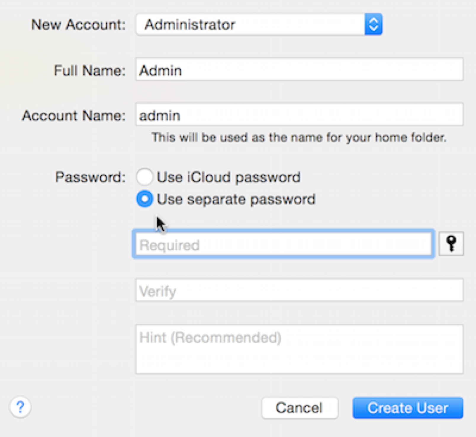 2. Click the + in the lower left to create a new admin user account. Do not use an iCloud password. Use a separate password or no password. This is only a temporary account and can be discarded after the procedure, but first you have to log into this new account so you can work on the other accounts.