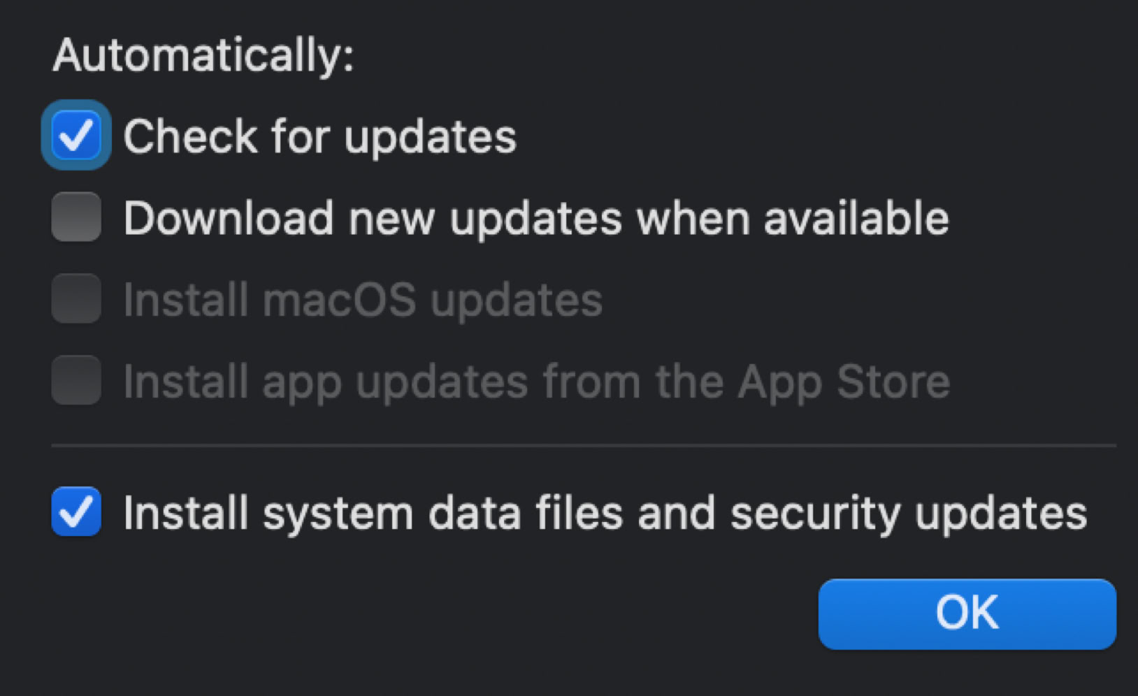 And the System Preferences Software Updates are also set correctly.In Software Updates click on Advanced. Set the preferences like this: