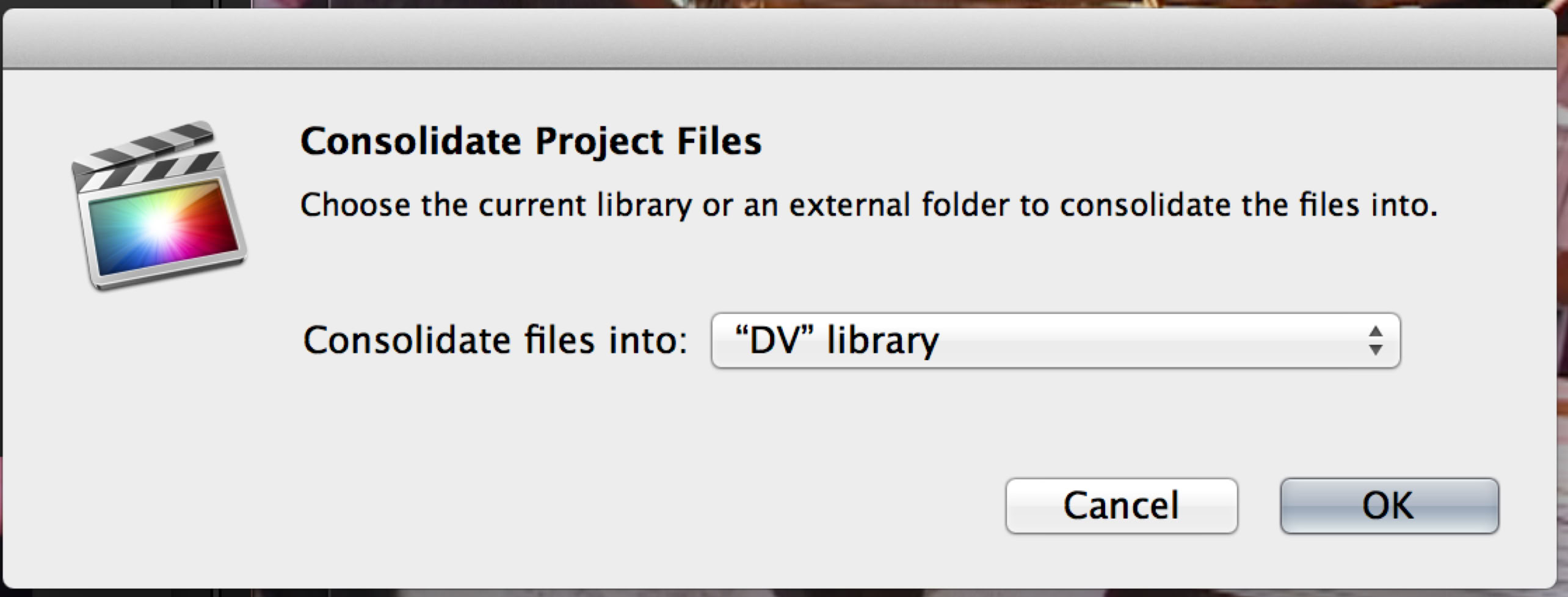 By selecting the library the project is already in, media that is not in the library, that was not copied into the event when the media was imported, will now be copied into the event and into the library. If you pick another location, you should create a folder, as all the clips used in the project will be moved into that folder. This is a move function so the clips in the events will be replaced by aliases. This is effectively the opposite of FCP’s organize function, which brings media that’s not in the event into the event to replace aliases. If you move the folder that the media was consolidated into from one drive to another, you will then have to relink the media inside FCP.