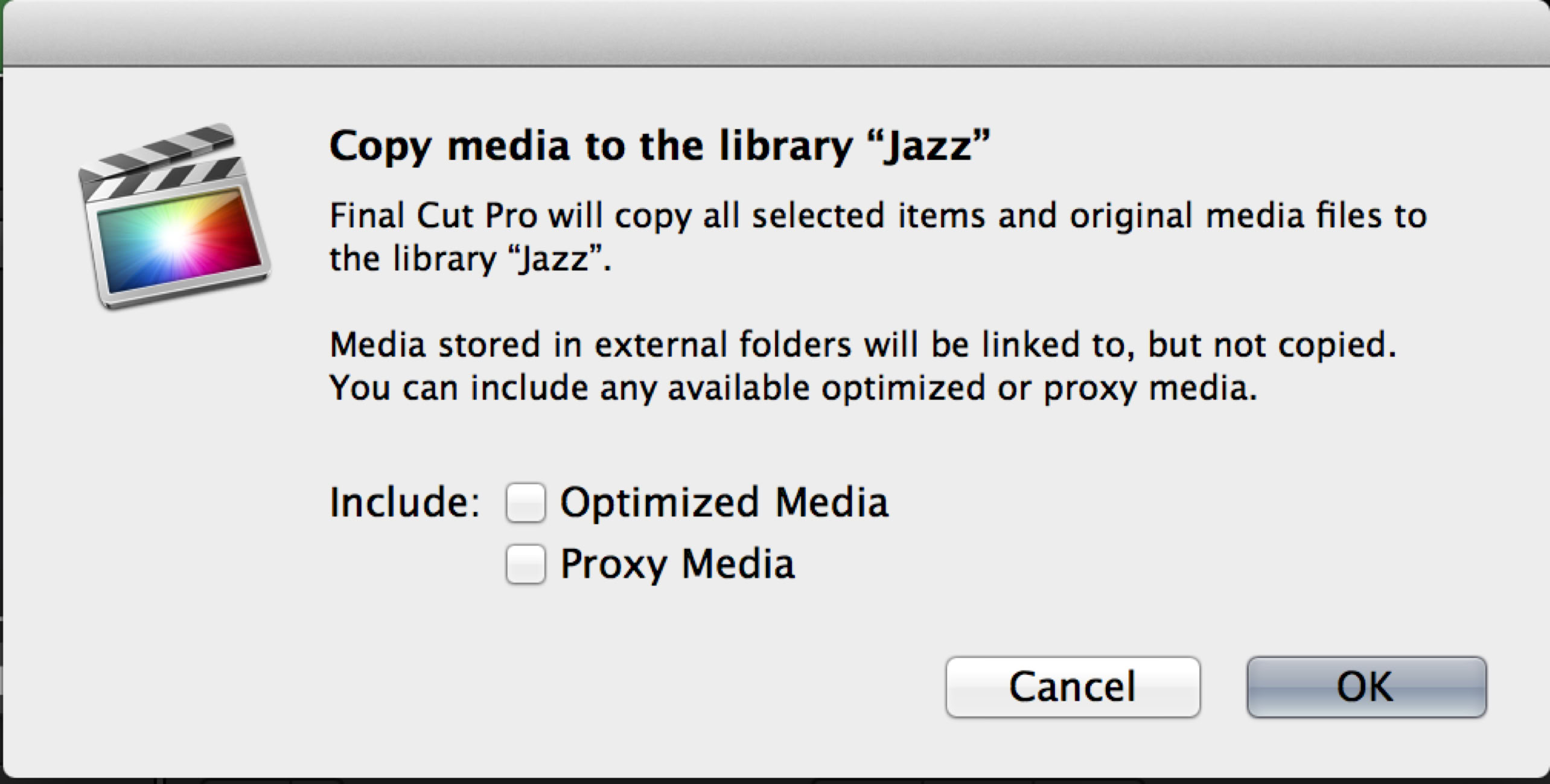 An important new feature in this version of FCP is the ability to copy the media to a new location outside of the library. This can be useful if you want to copy the media off one drive onto your media drive, but you want to leave it outside the library so other applications such as Motion can access it easily. Otherwise you would have to open the library package, find the file, and copy it out of the library.
