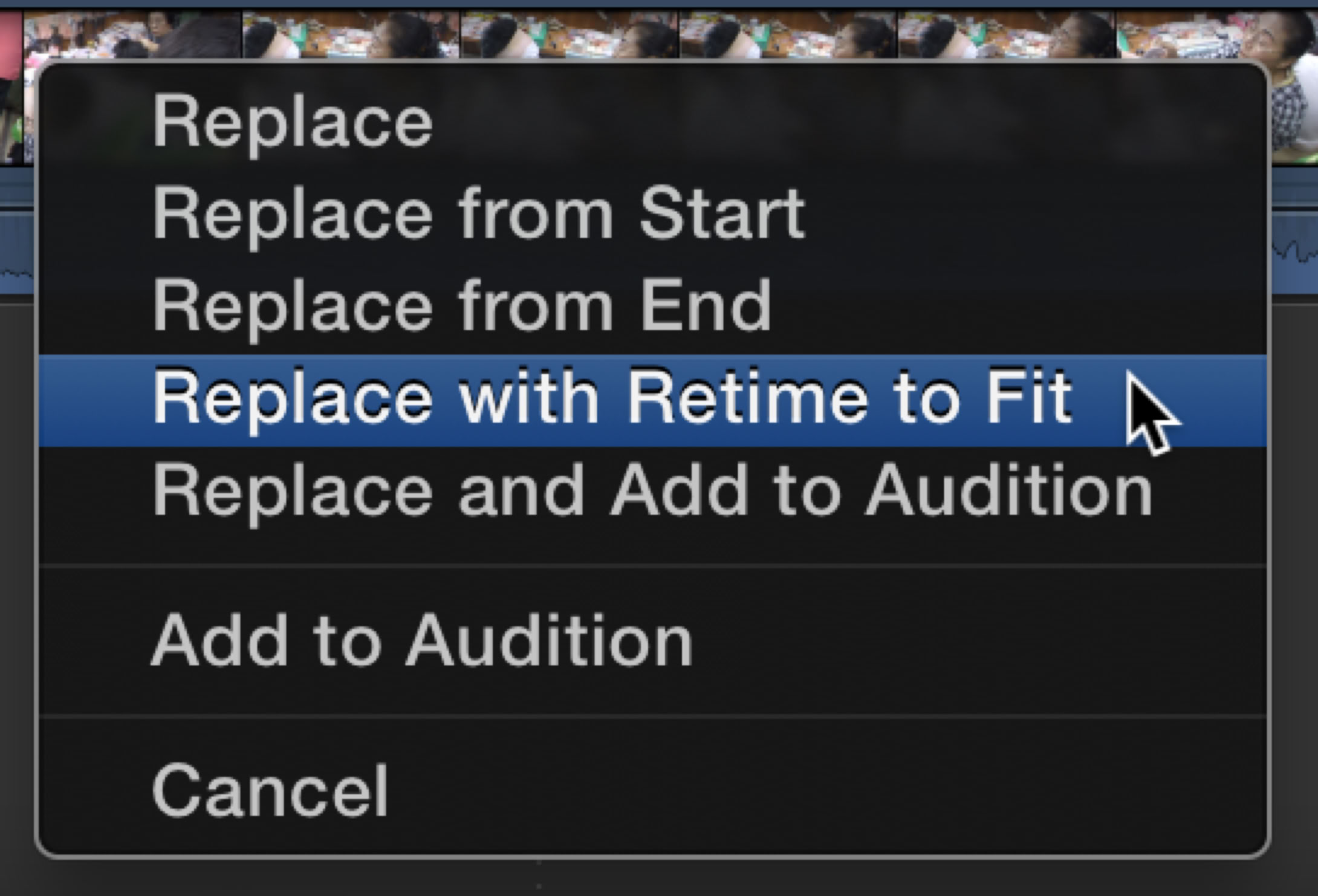 Another great new feature is the implementation of Retime to Fit, which legacy FCP called Fit to Fill. This has been added to the Replace popup menu when you drag one clip onto another clip.