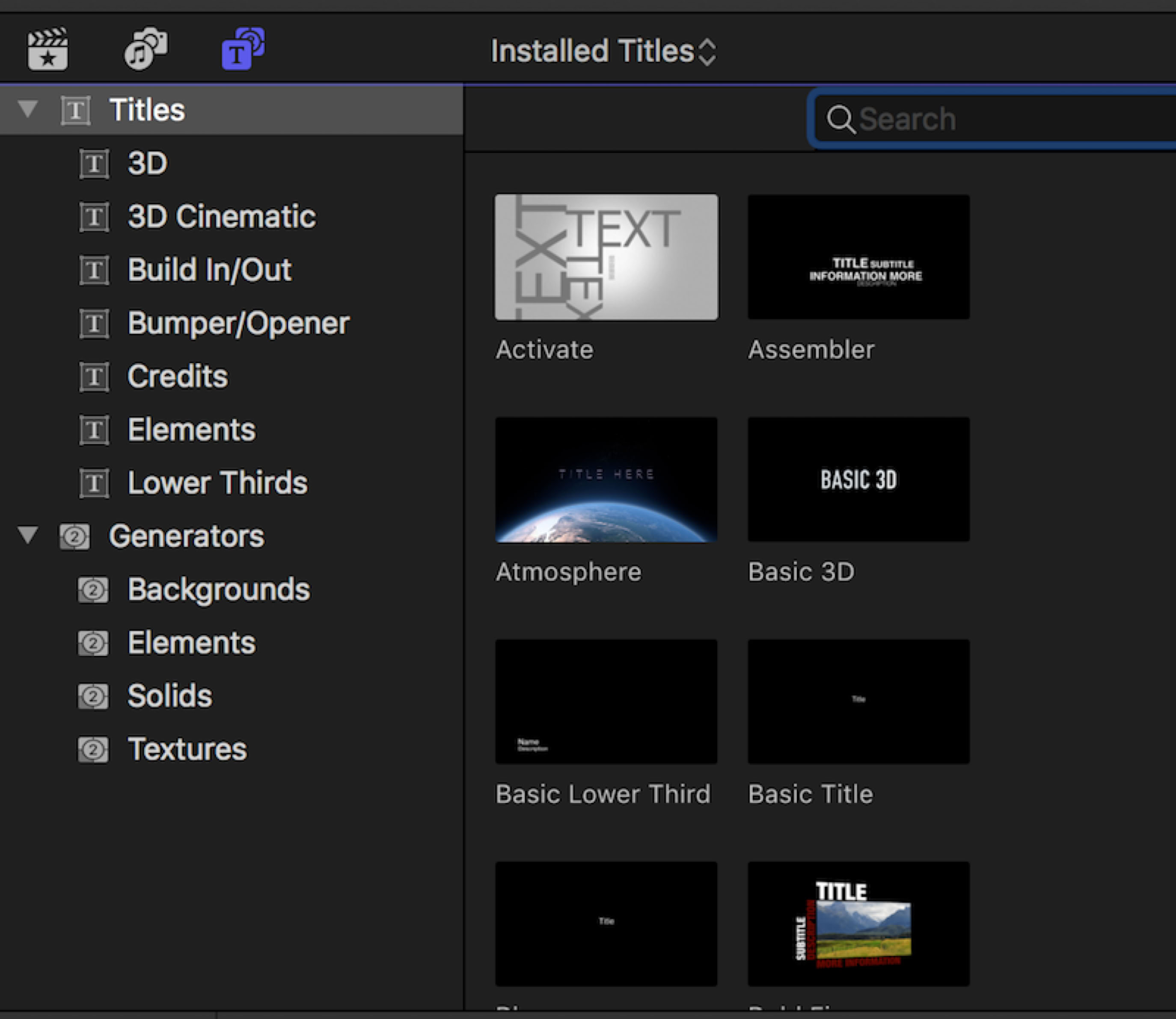The third button accesses the Titles and Generators Browser (Option-Command-1), which used to be two separate browsers in the Toolbar.