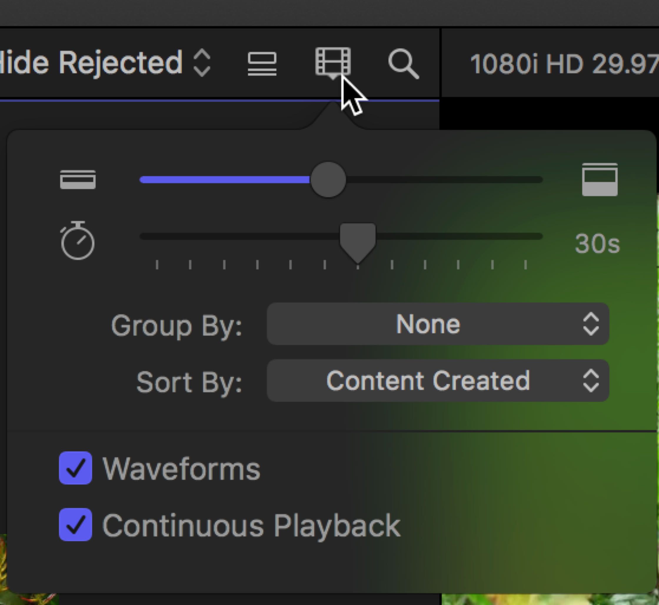 Notice the checkbox for Continuous Playback. This is new and allows you to play through your clips continuously in the Browser, skipping from one clip to the next as you could in iMovie.