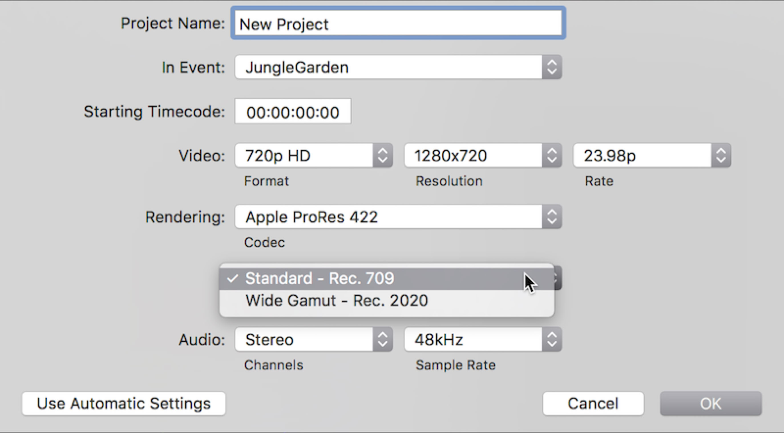 To get the option to select Rec. 709 or Rec. 2020, the properties for the Library have to be changed to from Standard to Wide Gamut. This is done at the bottom of the Library Properties pane. You will also see displayed this in the Share settings when you export your project. Note that only Master File ProRes or Uncompressed output will support Rec. 2020; everything else sets to Rec. 709.