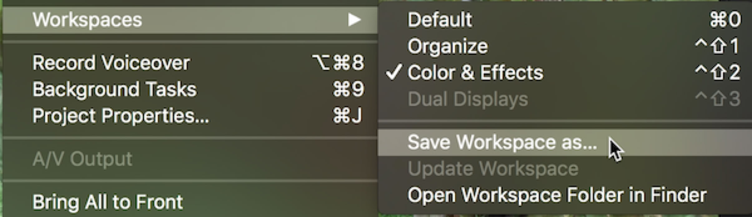 Control-Command-4. You can also toggle the Inspector full height by simply double-clicking the name at the top of the Inspector. It’ll shoot down to the bottom of the screen or collapse to the top of the Timeline pane.You can open and close the Timeline pane from the Show in Workspace submenu or with the keyboard shortcut Control-Command-2. Workspaces can be saved in the Window>Workspaces menu and can be called up from there.