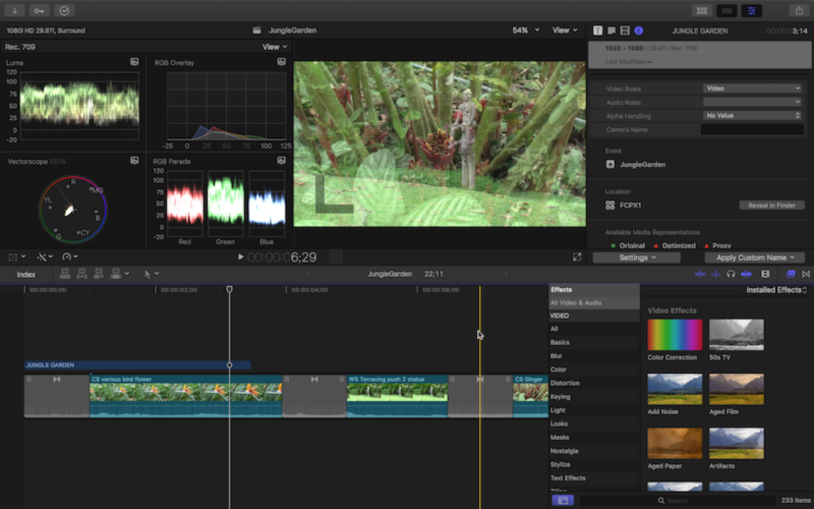 Another really important feature of the new interface is Workspaces that can be customized and saved. There are three basic workspaces: the original Default layout (Command-0 zero); an Organize layout, with no Timeline, a long Browser, central Viewer, and full length Inspector (Shift-Control-1); and Color & Effects (Shift-Control-2), which has scopes open, Viewer, Inspector, Timeline and Effects Browser.