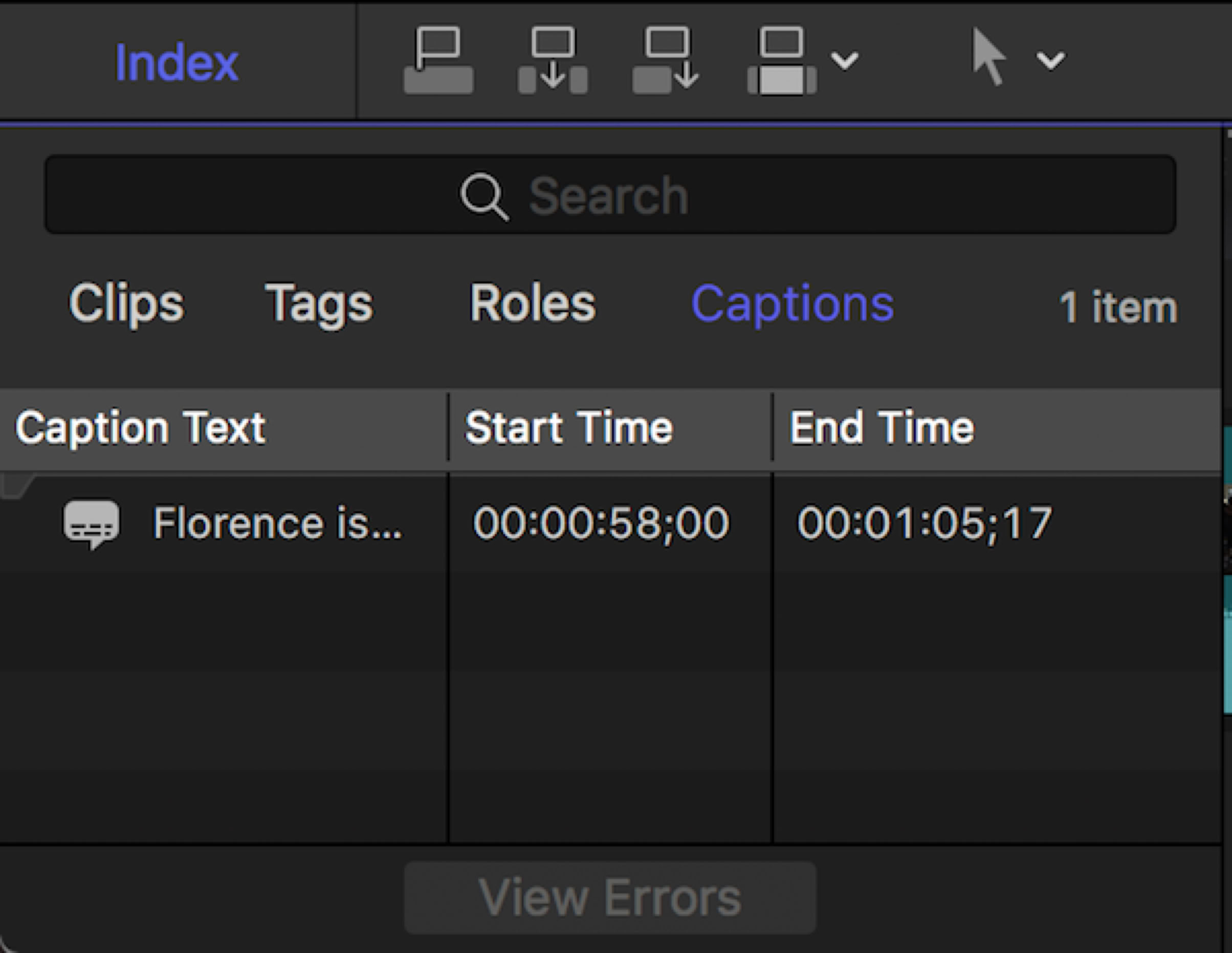 In FCP Captions can be creating in a great many languages and appear in the Timeline as separate Captions having a separate language subrole.You can create a language by selecting the Captions and using Edit>Captions>Duplicate Captions to New Language. You choose which Captions and language is visible in the Timeline Index.You can also hide captions. The Index changes only effect the display in the application and not any export functions.The Index will also display the caption content and validate it.Captions with validation problems like overlaps will appear in red in the Timeline.You can select in the Index to only display Captions with errors Validation confirms the text is correctly formatted, without an incorrect characters, and without overlapping. Because of FCP’s trackless architecture, Captions can overlap in the Timeline. The overlap can be fixed automatically from the Edit>Captions menu. You can also split Captions if they’re too long from the Captions menu or with Control-Option-Command-C. There is also a Join Captions command if you want to combine Captions.Splits divide the Caption in half, regardless of playhead and Skimmer position, splitting the text at line breaks.