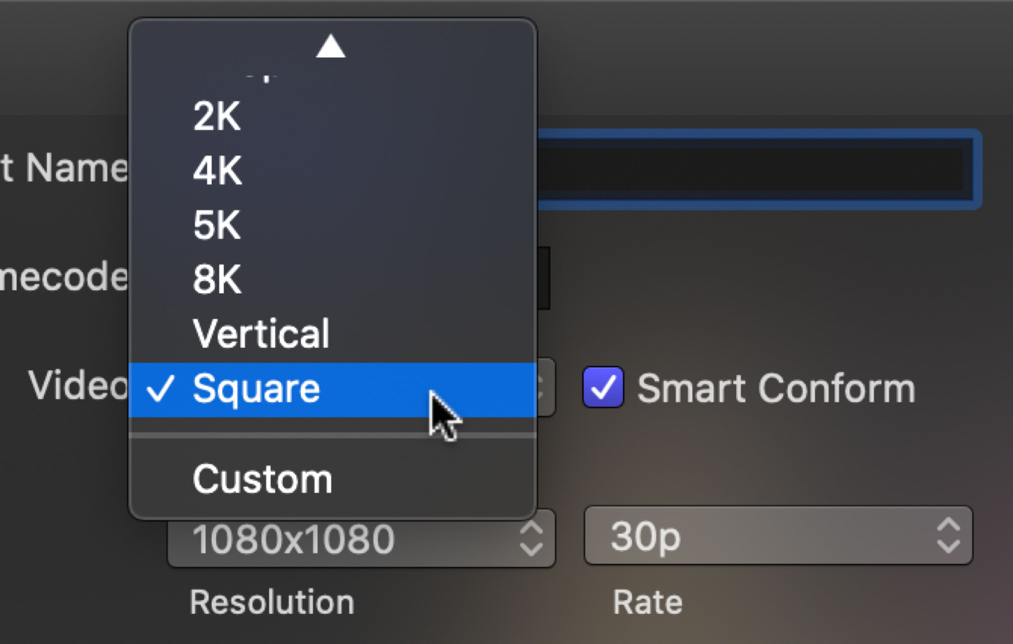 You have been able to make custom projects in vertical or square aspect ratio, but not these features are built into the project pane. In addition existing projects can be convert to these formats. First, you’ll want to use overlays to make sure your titles line up. You’ll need to add the overlay using View>Show in Viewer>Choose Custom Overlay>Add Custom Overlay. This is also in the Viewer’s View menu. But first you have to create the overlay, which is a 16:9 graphics file with the central vertical of square area. The wonderful guys at Ripple Training, Steve Martin and Mark Spencer, (https://www.rippletraining.com) have created a pair that you can download. You can download it through this link https://bit.ly/3jo7vy3. Once you’ve added the overlays they are stored in ~/Library/Application Support/ProApps/Custom Overlays. In the Viewer View popup you can set the transparency of the black area. Here it’s set to 50%, but 75% usually works better.