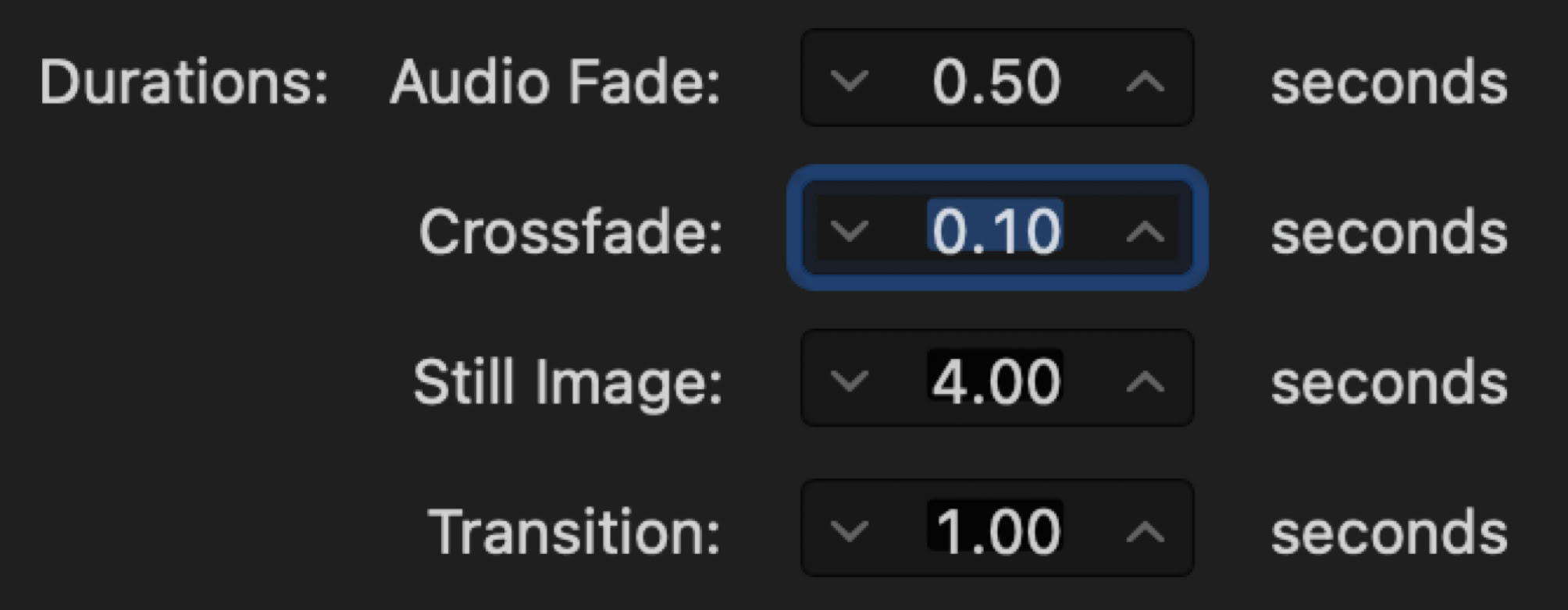 An audio improvement that’s long been asked for is the ability to add Audio Crossfades. Now you can select two adjacent clips in the primary or a secondary storyline and press Option-T or use Modify>Adjust Audio Fades>Crossfade. Nothing seems to happen but a crossfade is created. Double click the audio portions of the clips to expand them and you’ll see the overlap and the fades. There are now new Editing preferences that lets you set Crossfade default durations in addition to Audio Fade durations. The default crossfade is quite short, ideal for removing clicks at cut points. To make the crossfade you must have handles on the clip or the fade won’t be added; the clips will not be pulled up like a video transition.