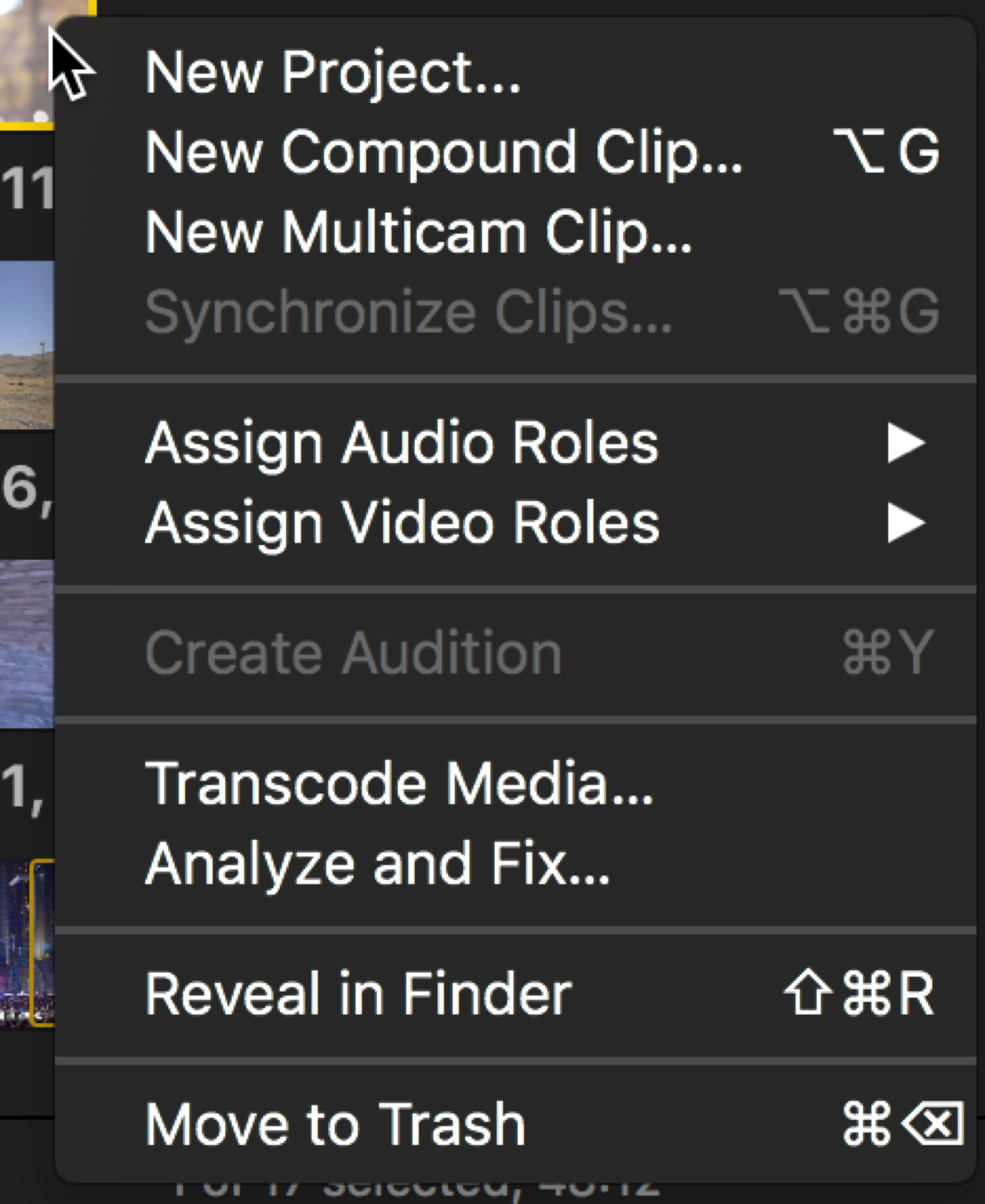 In 10.3.x you could Open Clip from inside the Timeline, by right-clicking on it, or on the clip in the Browser, or by using the Clip menu. Despite the FCP team’s best efforts this continued to cause problems for new users who would sometimes begin editing by using the Open Clip function and then proceeding to edit their program into a single clip. In 10.4 Open Clip has finally disappeared from the shortcut menu in both the Timeline and the Browser. You can still open a clip that’s in a project in the Timeline or open a clip in the Browser from the Clip menu. In place of Open Clip in the shortcut menu in the Browser there is now New Project. If you select this option on a clip in the Browser, it will bring up the New Project dialogue and then drop the clip into it. You can also select multiple clips and use this option to add all the selected items. or the ranges marked in the clips, into a new project, a really quick way to get started.