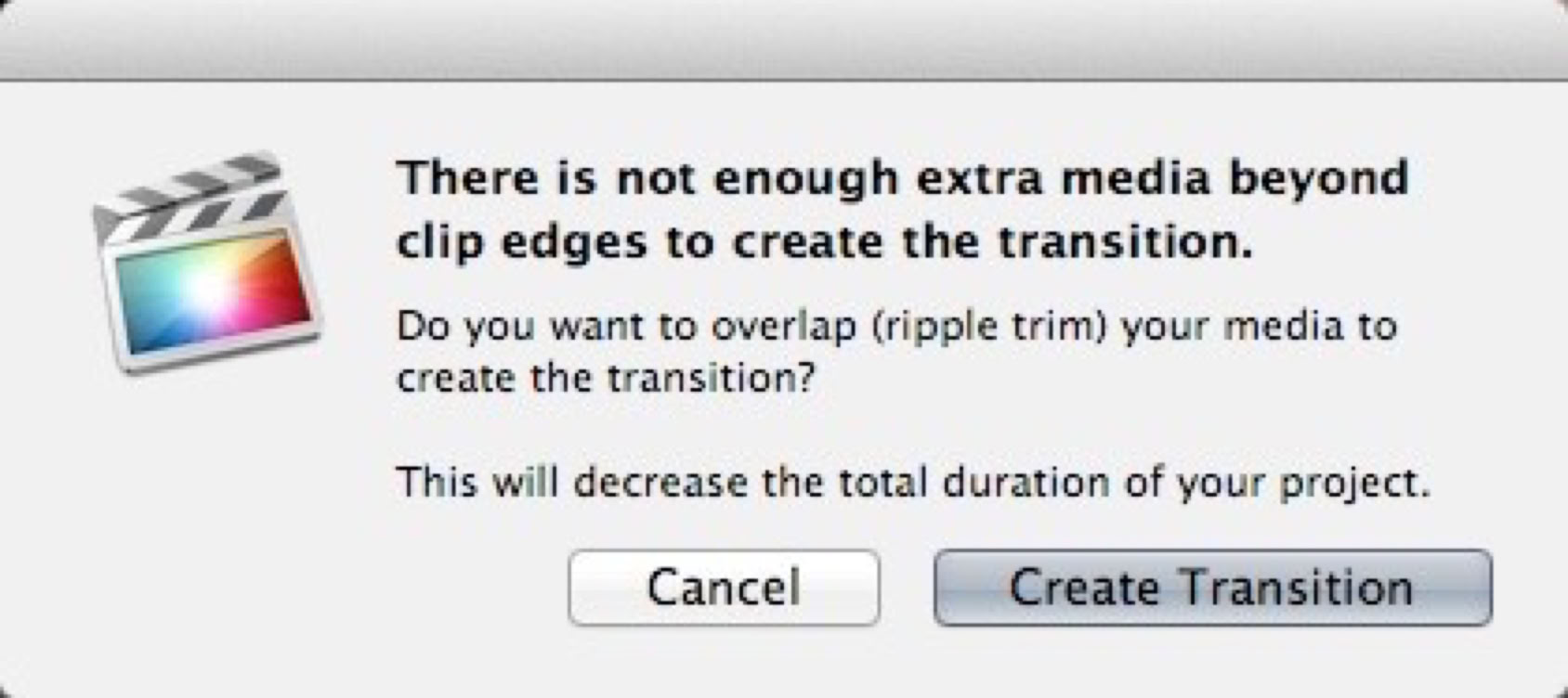 p198 Available Media: This has changed again. It’s been different in every version of FCP to date. First the default behavior was to make transitions will Full Overlap as described in this section. Then the default behavior was changed to Available Media. Now there is no option for Full Overlap as a preference. You must have available media to create the transition overlap, or you will get this error message.