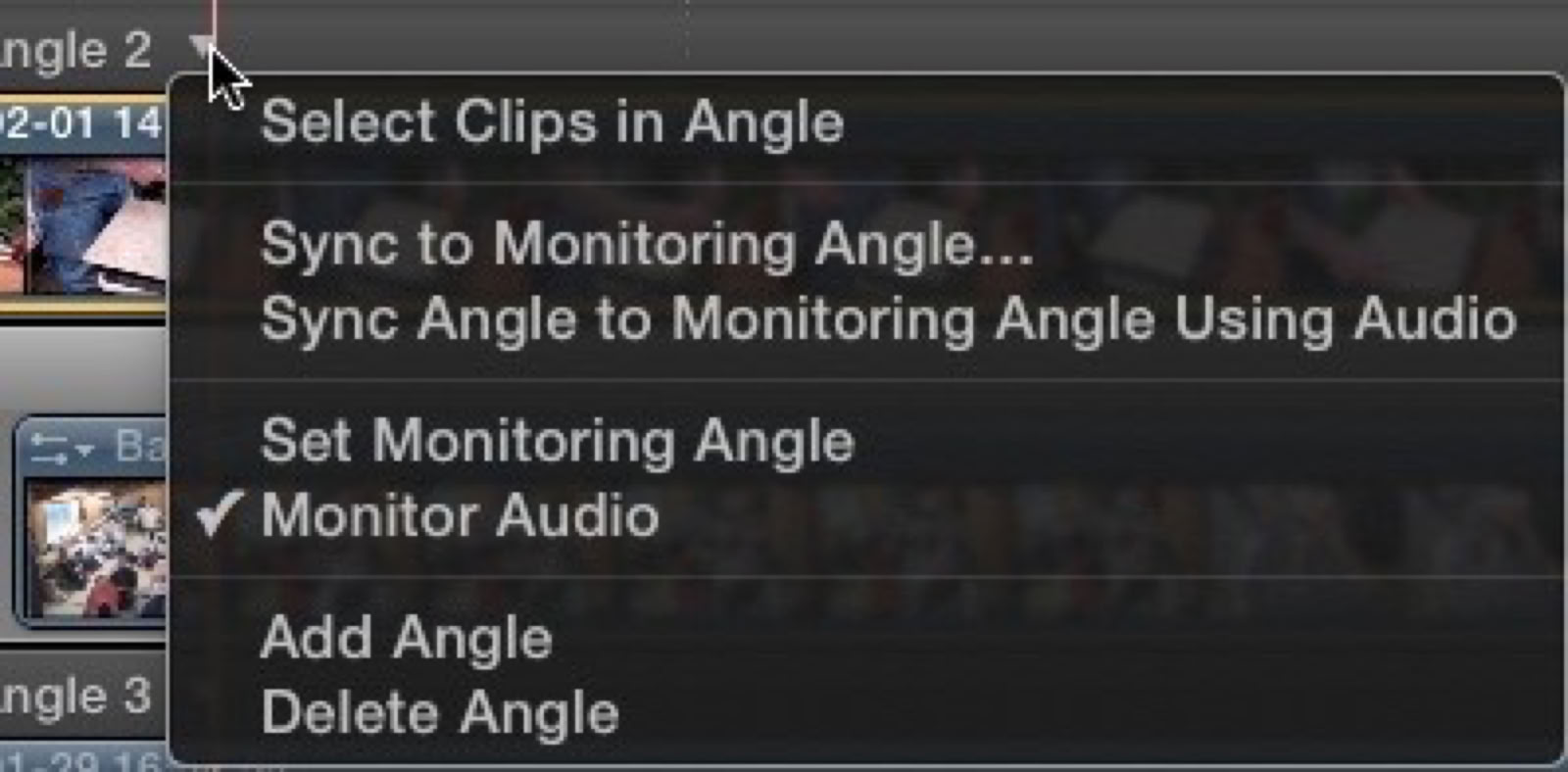 An empty lane is created into which you can drag any clip you want. You can drag the clip up and down the Timeline to adjust its sync. Notice the other items that appear in the drop-down menu, especially Sync Angle to Monitoring Angle Using Audio. This allows you to select an angle to which to sync your added clip. Turn on monitoring for the angle you want to sync to and in the added angle’s drop-down select Sync Angle to Monitoring Angle Using Audio.