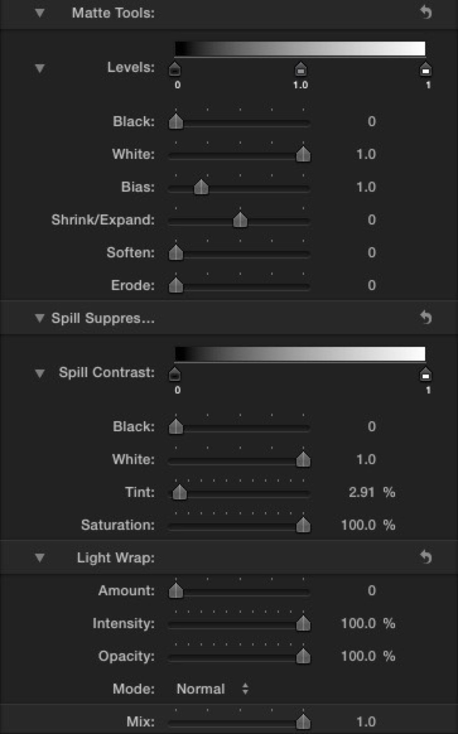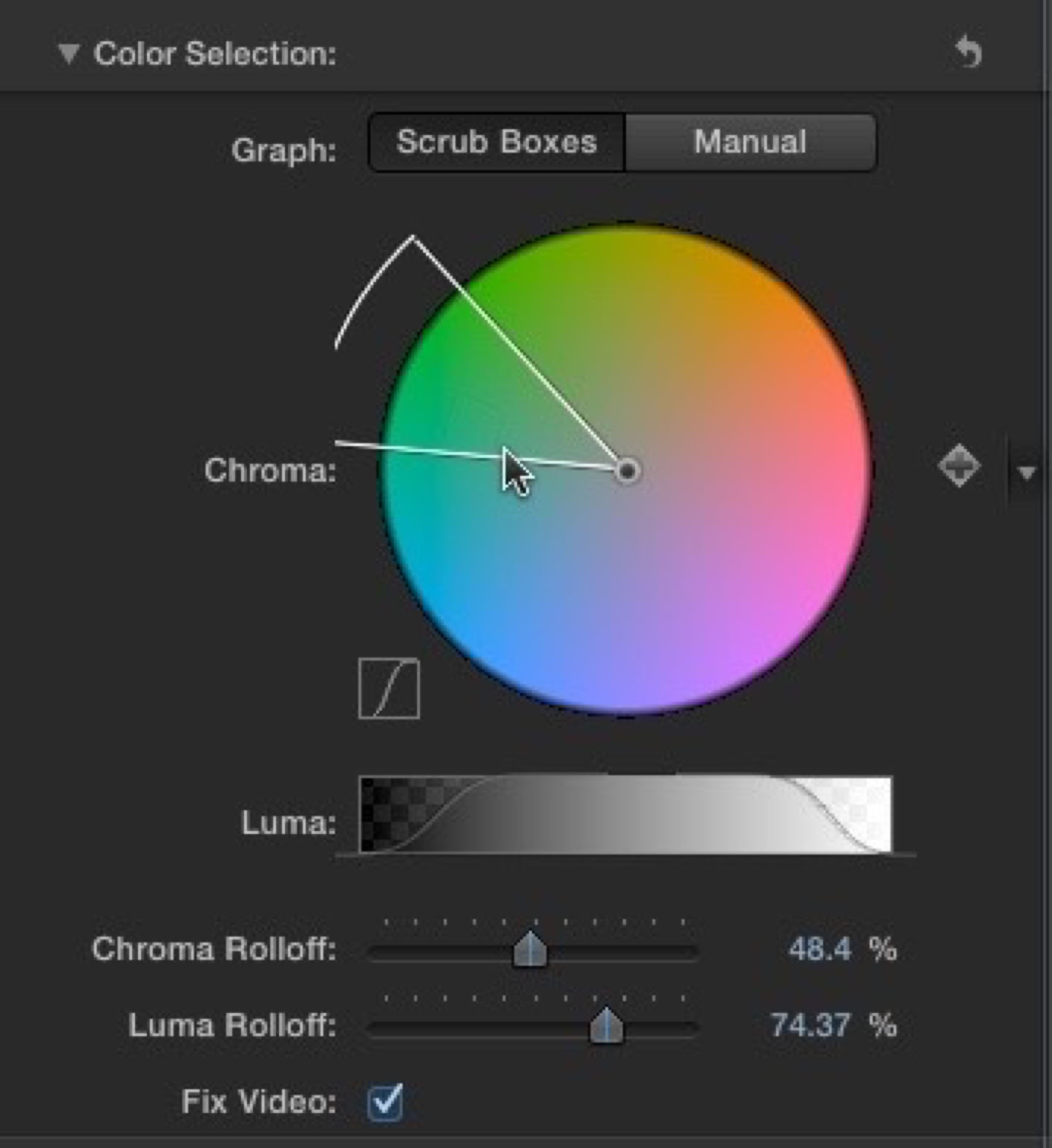 In addition to the controls briefly described for the Keyer beginning on p255, Apple has introduced some advanced chroma keying tools to improve color sampling and edge quality. There is now a Color Selection color wheel with separate luma controls below it and sliders to control roll-off.