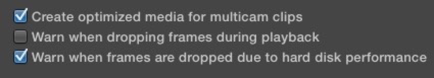 There are new Playback preferences. In addition to a new preference to optimize material used in multicam clips, there are also new preferences for controlling how the application responds to dropped frames.